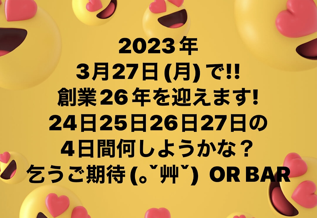 2023/02/27 お知らせ!! 来月の今日!!当店の創業26周年記念日!!さて、何をしようかな… 2023/01/31 1月最終日です!! 本日も、元気にOpenしてます(≧∇≦)/#総曲輪orbar #orbar #bourbon #バーボン #喫煙可能店 2023/01/01 2023年1月1(日) 新年明けましておめでとう御座います。今年も、皆様どうぞ<(_ _)>よろしくお願いします。 PREV 11 12 13 NEXT