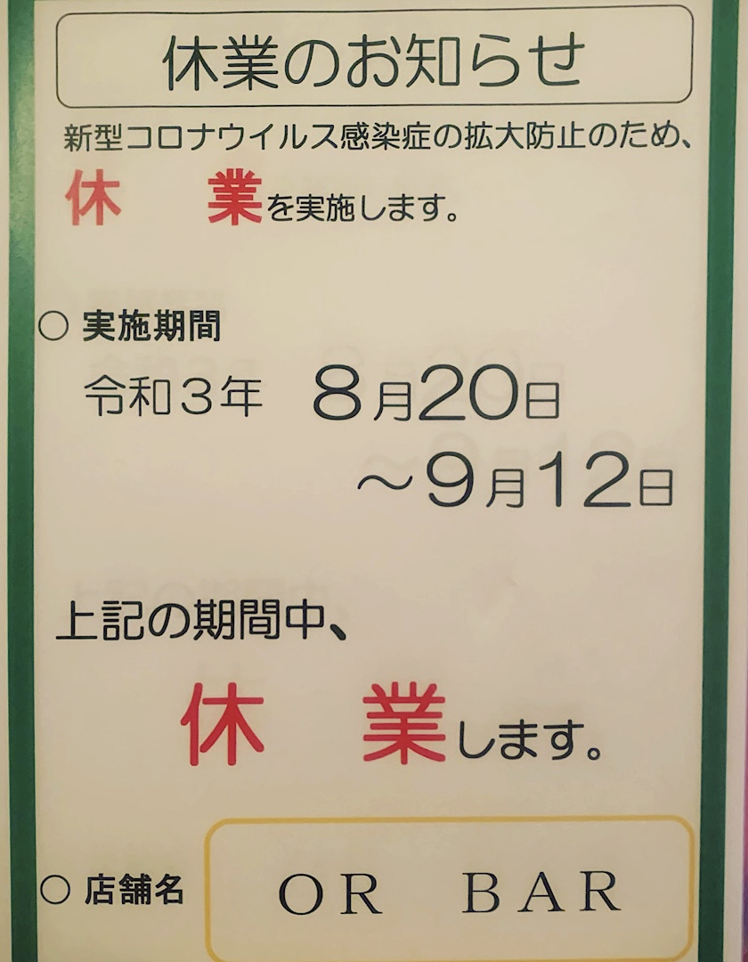 2021/08/19 休業のお知らせ❗️ 新型コロナウィルス感染症の拡大防止のため!休業を実施します!期間は、8月20日(金)~9月12日(日)まで!その後は、国、県、市の要請に従います。 2021/08/12 お盆期間のお知らせ! お盆期間中の、営業日(^^)/ 2021/08/10 お知らせ!! お盆の営業日 PREV 30 31 32 NEXT