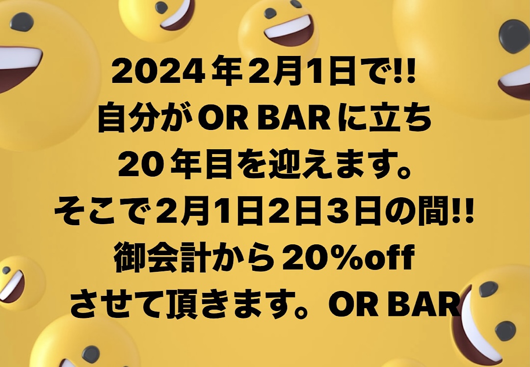 2024/03/23 お知らせ(≧∇≦)/ 今月末の27日で、当店創業27年目を迎えます!!27年目を、迎え入れれるのも、沢山のお客様方に支えて頂いた結果だと思います😊今後とも、お客様方に末永く寄り添い!!末永くお店続けて行きたいと、思ってますので、どうぞ<(_ _)>よろしくお願いします。 2024/02/22 お知らせ!! 明日の営業ですが…母の通夜の為お休みさせて頂きます!! 2024/01/25 緊急告知 2004年2月1日に、自分がOR BARの3代目店長になり、2015年に前オーナーから店を引き継ぎ、2024年2月1日で、20年目を迎える事が出来ました。そこで、2月1日(木)~3日(土)の3日間御会計寄り、20%offさせて頂きます。 PREV 7 8 9 NEXT